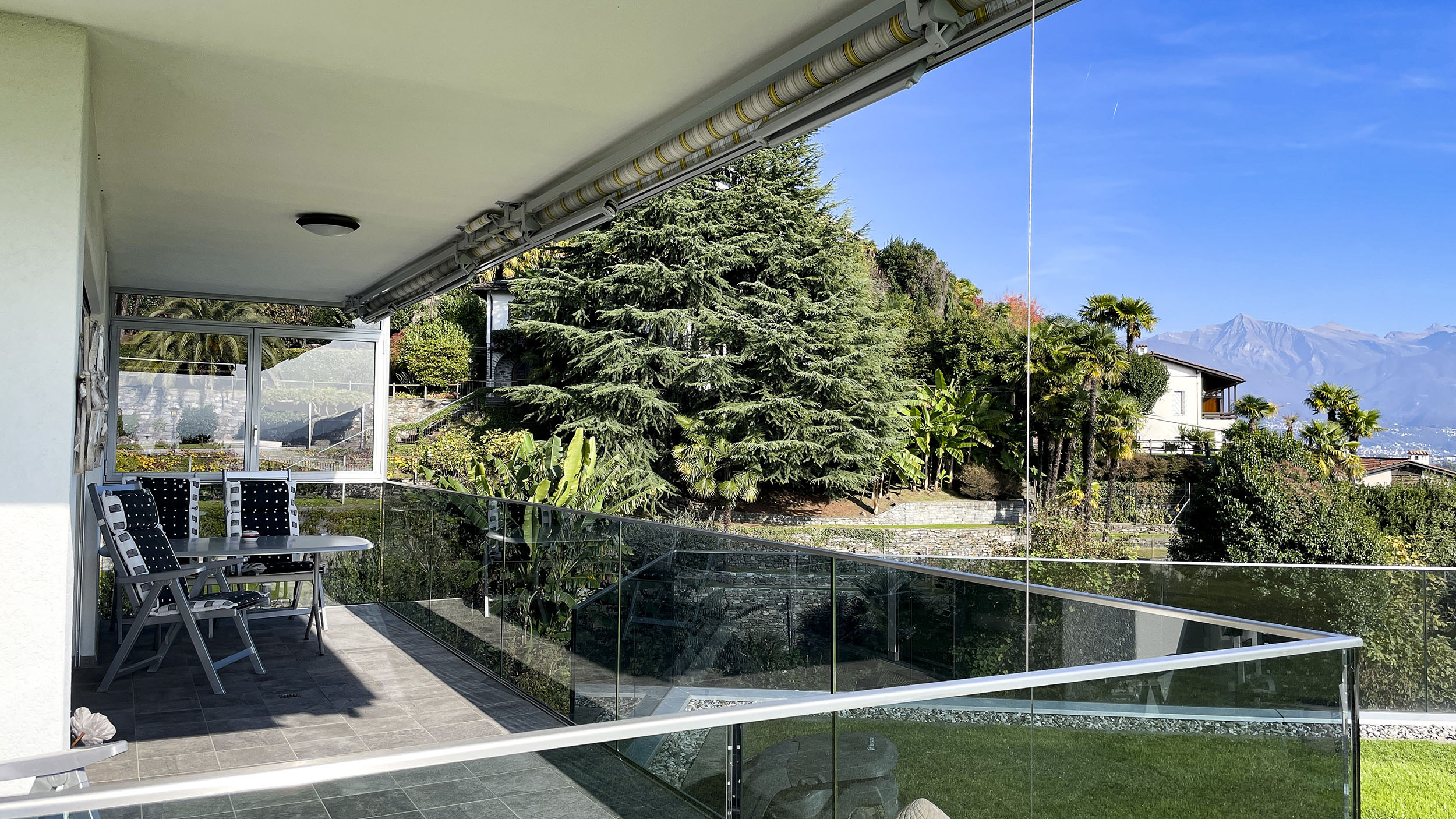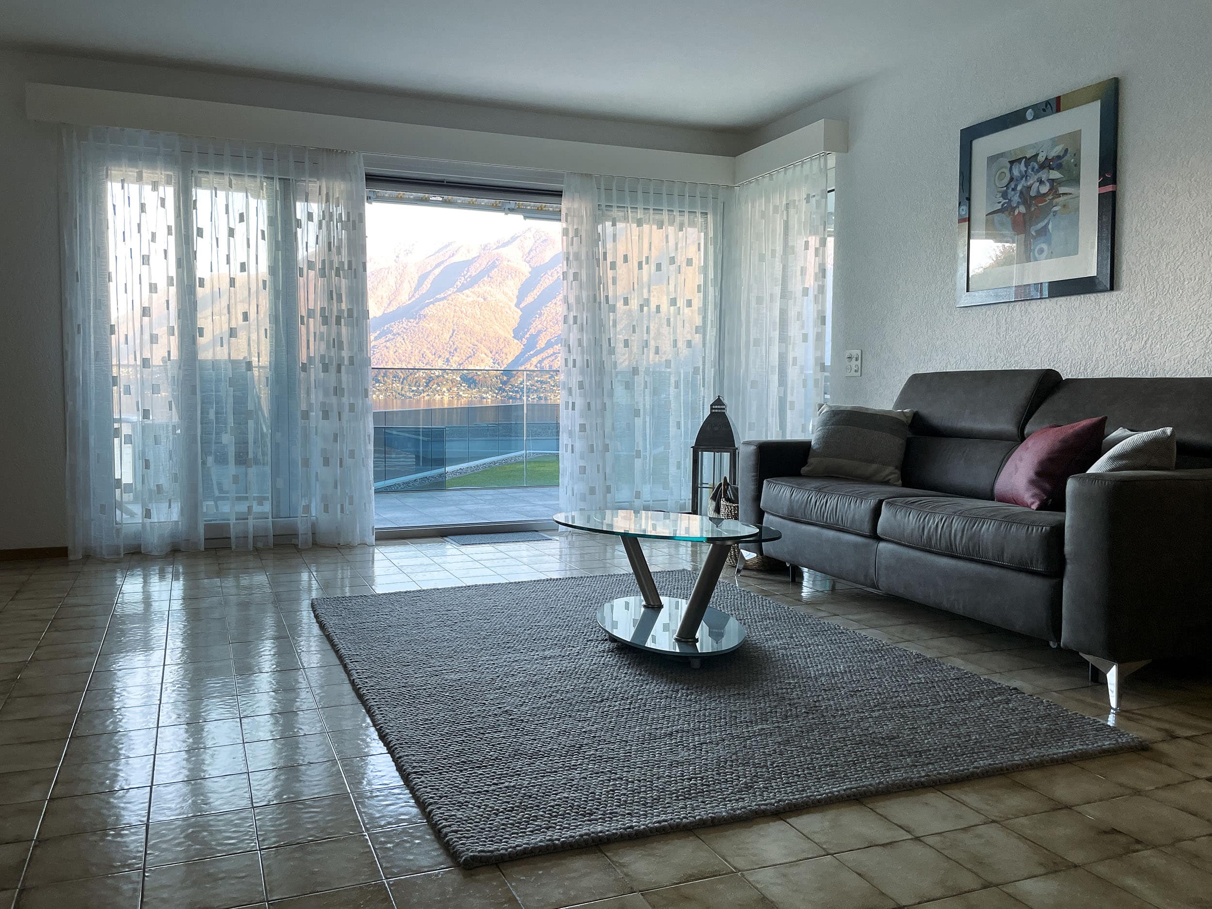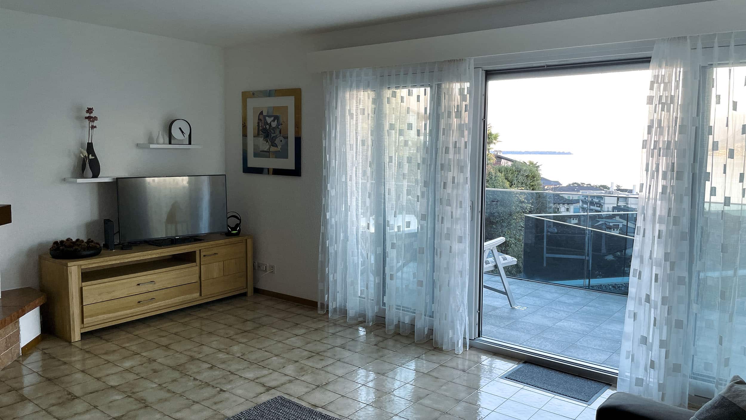 Erlebe pure Entspannung in unserer authentischen Tessiner 2.5-Zimmerwohnung mit grossem Balkon und einem unvergleichlichen Blick auf den Lago Maggiore – bis nach Italien.